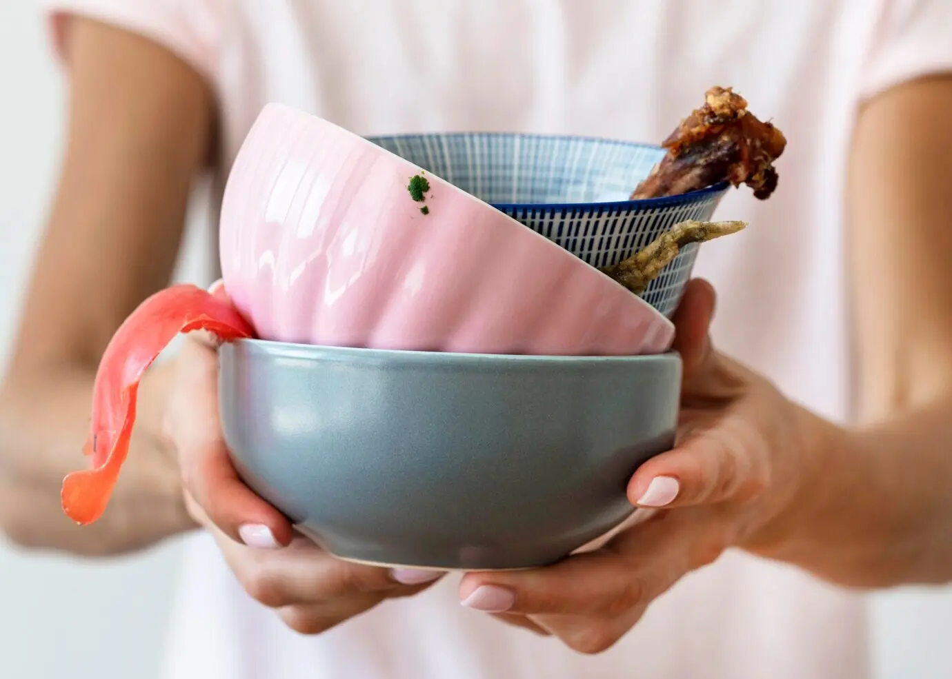 Die Delboeuf-Illusion zeigt, dass identische Mengen größer wirken, wenn der Teller kleiner ist und der Rand schmal. Hoher Farbkontrast zwischen Speise und Teller verstärkt die visuelle Kontrolle: Helles Gemüse auf dunklem Grün wirkt voluminöser, wodurch du automatisch weniger nachlegst und trotzdem satt wirst.